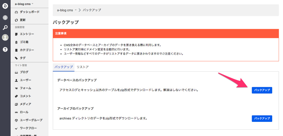 方法1:管理ページのバックアップからバックアップ・リストアを行なう