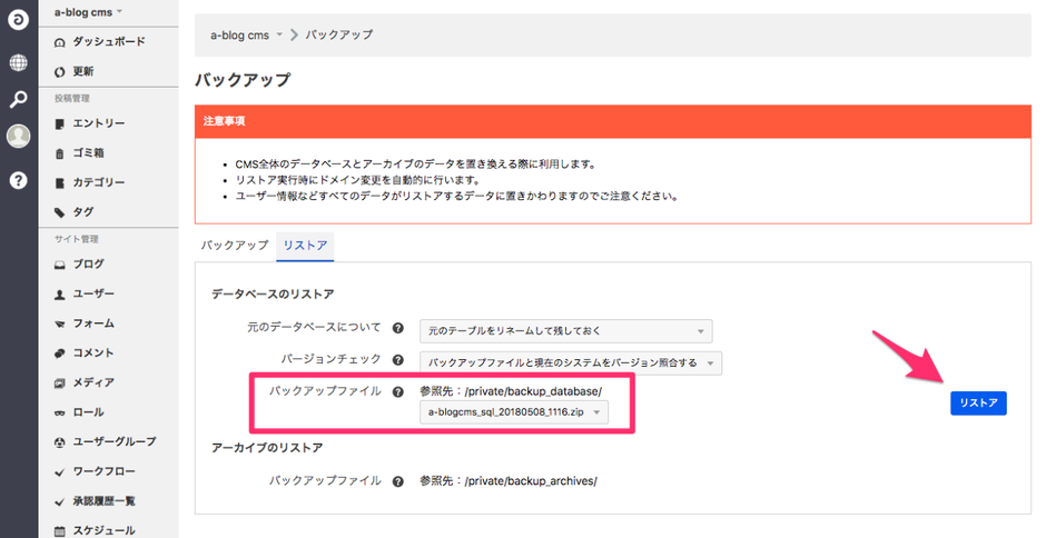 本番サイトにアクセスし、管理ページ > バックアップ > リストアにアクセスします。 /private/backup_database/にzipファイルを設置すると「バックアップファイル」の項目にセレクトメニューが現れます。先ほど設置したzipファイル名を選択し、「リストア」ボタンをクリックしてリストアします。