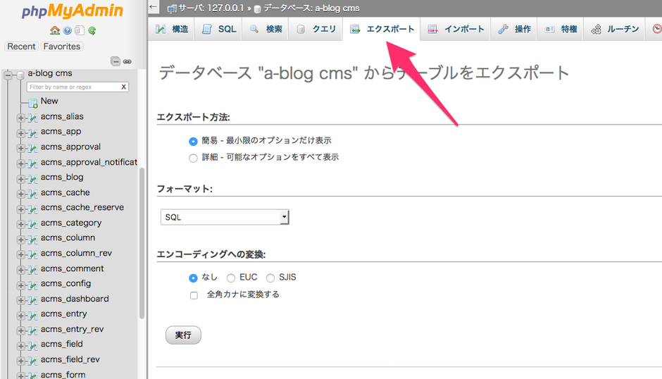 テストサーバーのphpMyAdminにアクセスし、テストサイトで利用しているDBのエクスポートを実行します。ダウンロードしたエクスポートファイルを、本番サーバーのphpMyAdminへインポートを実行します。この時、既に入っているa-blog cmsのデータベースは削除、接頭辞を別にして残しておく、DBを別に作るなどいくつか方法があります。DB名や接頭辞(suffix)を変更した場合は必要に応じてconfig.server.phpを変更してください。