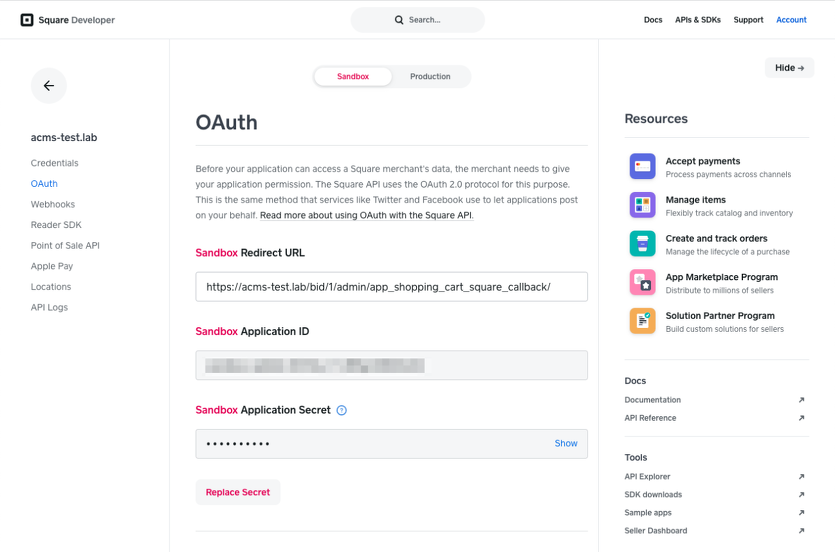 画面左のメニューから、アプリケーションの OAuth 設定ページに移動します。開発中であれば Sandbox タブ、本番運用なら Production タブを選択します。(画像は Sandbox タブ)