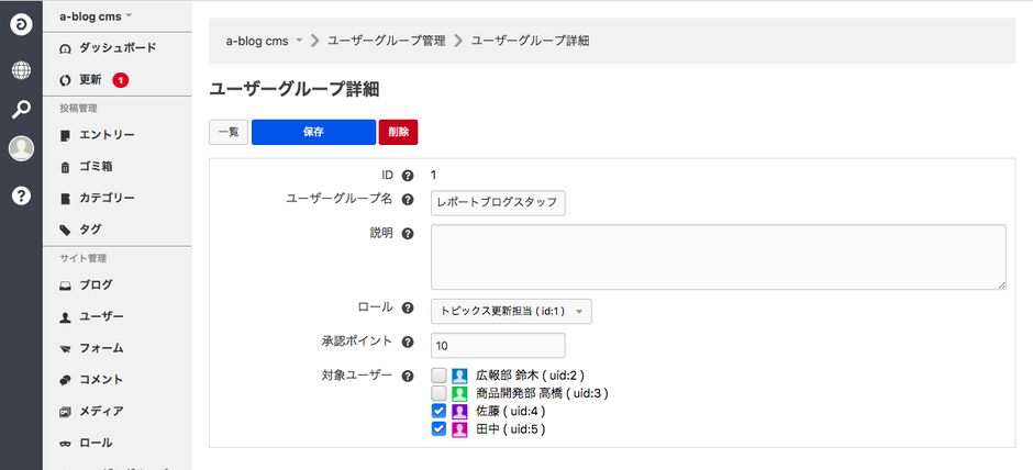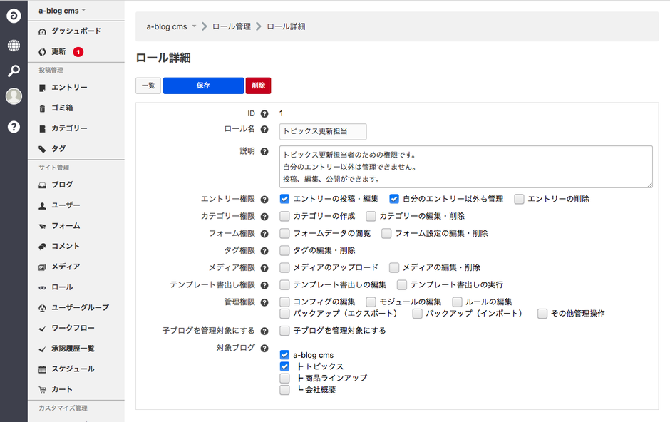| エントリー権限 | エントリーの投稿・編集、自分のエントリー以外も管理、エントリーの削除 |