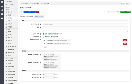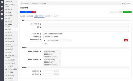 エンタープライズライセンスの承認機能はデフォルトで有効になっており、ワークフローの設定は各ブログ管理または各カテゴリー詳細ページにある「承認ワークフロー」タブで行えます。