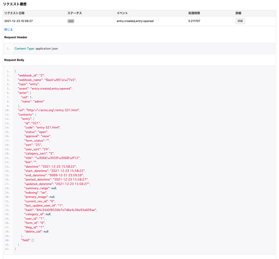 エラーのステータスコードを出したリクエスト履歴の詳細を開くと、下図のようなRequest Bodyが値として返ってきます。そうすると、使用できる変数が確認できます。