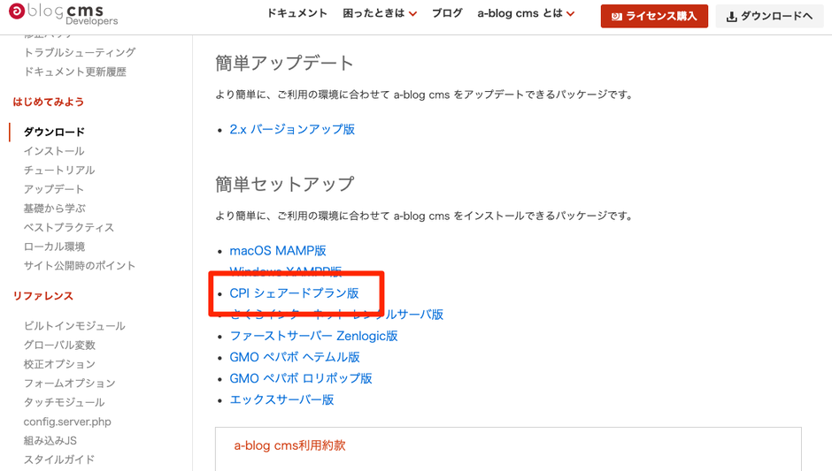 a-blog cms デベロッパーサイトのダウンロードの下の方にある「簡単セットアップ」の一覧から「CPI シェアードプラン版」がダウンロードできますが、以下のリンクからもダウンロードできますので、まずはファイルをダウンロードください。