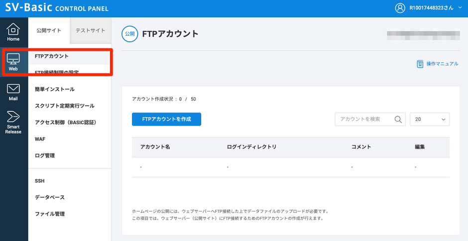 サーバコントロールパネルの黒いアイコンが並んでいる部分の2つ目の Web をクリックしてください。すると、その横に 公開サイト / テストサイト の切り替えタブがあり、最初のメニューに FTPアカウント があります。