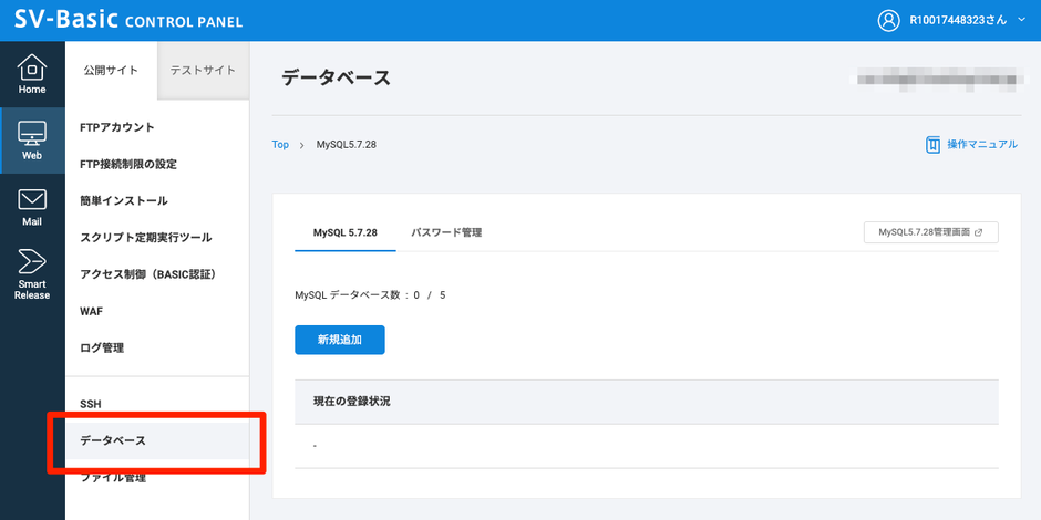 データベース のメニューをクリックし(新規追加)からデータベースを作成します。
