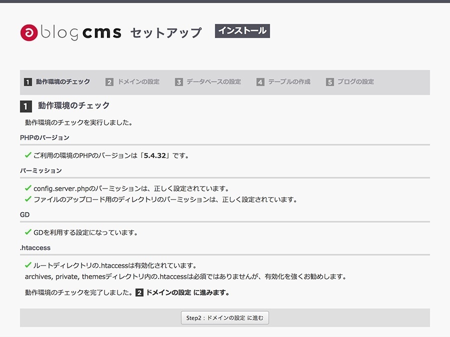 アクセスすると「setup」フォルダに自動で転送され、以下のようなインストール画面が表示されます。ページの一番下にある「動作環境のチェックを実行する」ボタンを押してください。