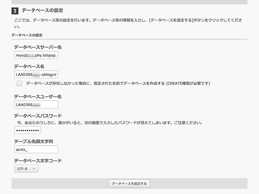 「データベースを設定する」ボタンを押すと、接続テストを行います。正常に接続できたら、次のステップへ進んでください。以降は画面の指示に従って操作してください。