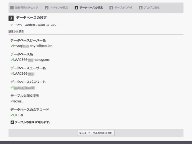 「データベースを設定する」ボタンを押すと、接続テストを行います。