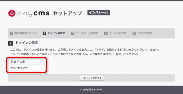 ほとんどの場合、現在アクセスしているドメイン名がすでに入力されています。そのまま「ドメインを設定する」ボタンを押してください。