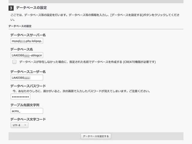 データベース名 : 任意の名前を英数字で入力します。a-blog cmsを使用していることが、あとでわかる名前にしてください。