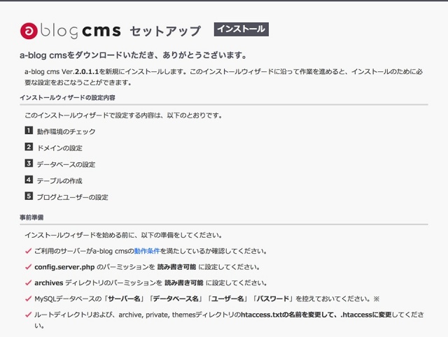 以下の手順で a-blog cms のインストール画面が表示されます。
