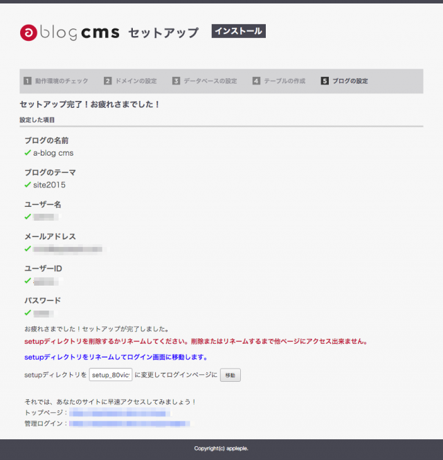 作成が完了すると、「setup」ディレクトリの名称を変えるよう促されます。