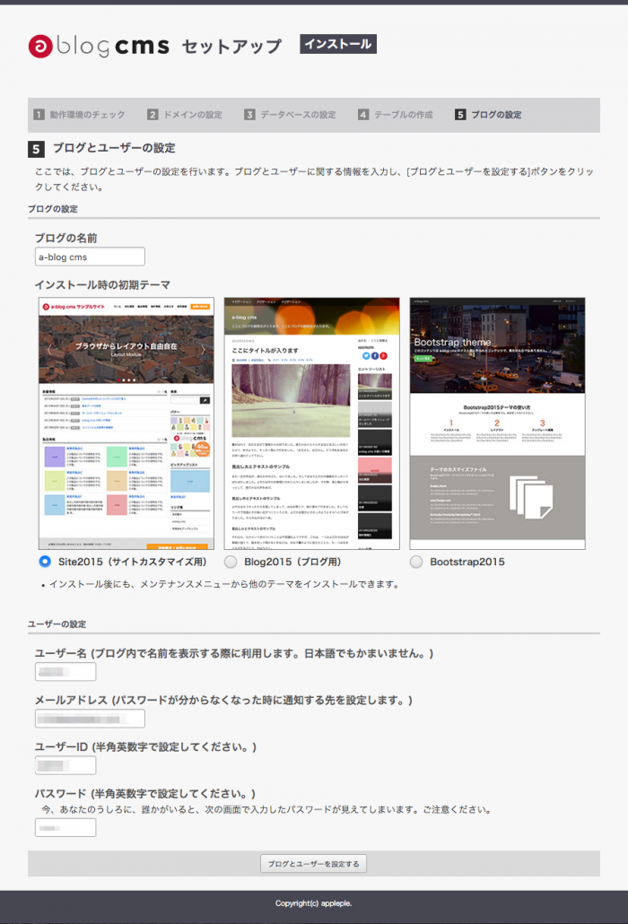 インストールオプション : フィーチャーフォン(ガラケー)・スマートフォン専用テーマの利用に関するチェックです。a-blog cmsのテーマは、すべてスマートフォンに対応しているため、基本的にチェックの必要はありません。 最初のユーザーアカウントを作成します。 ログインに必要な情報を入力し、「ブログとユーザーを設定する」ボタンを押してください。
