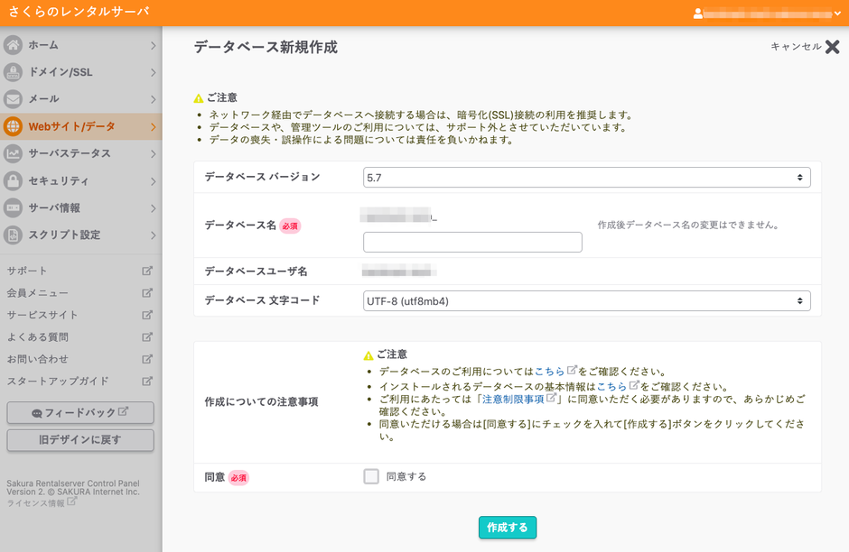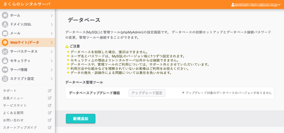 さくらのレンタルサーバーでは、初期段階ではデータベースは用意されておりませんので(新規追加)ボタンからデータベースを作成します。