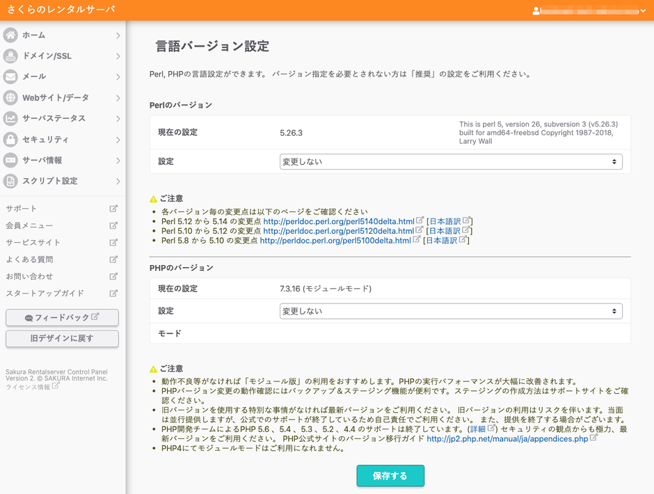 この新しいコントロールパネルで PHP の設定は「スクリプト設定 > 言語バージョン設定」を開きます。