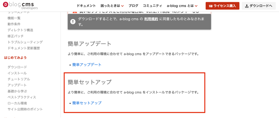 a-blog cms デベロッパーサイトのダウンロードの下の方にある「簡単セットアップ」をダウンロードください。