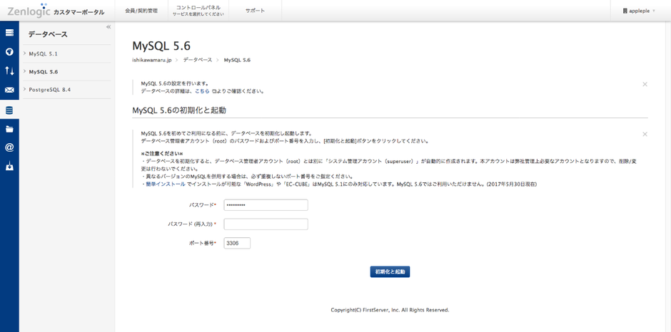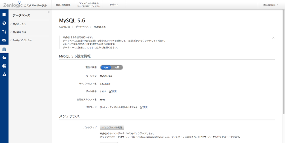 データベースは MySQL を利用します。Zenlogicで利用できるバージョンは5.1と5.6です(2017年7月時点)。