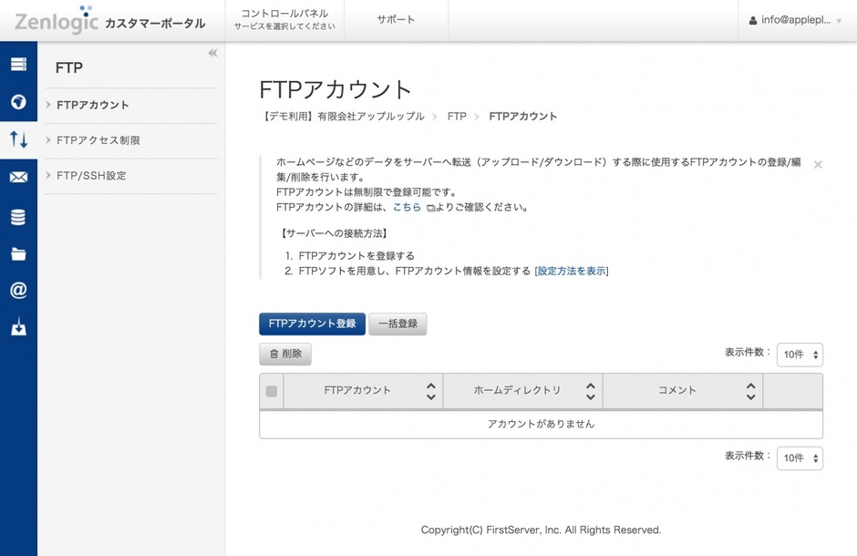 a-blog cms のプログラムをアップロードする必要がありますが、そのためのアカウントが初期状態では設定されておりませんので、この FTPアカウントの設定より登録を行ってください。