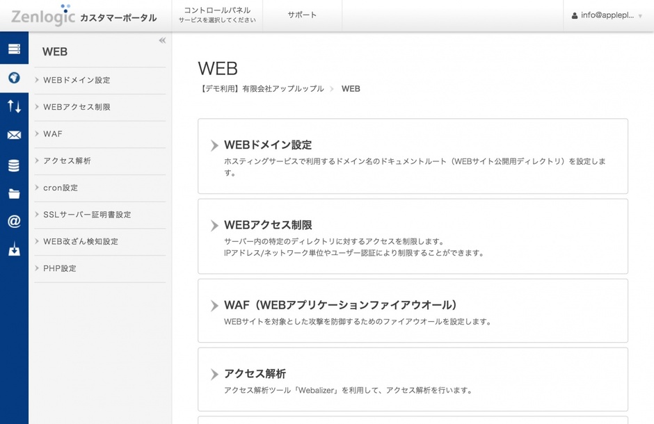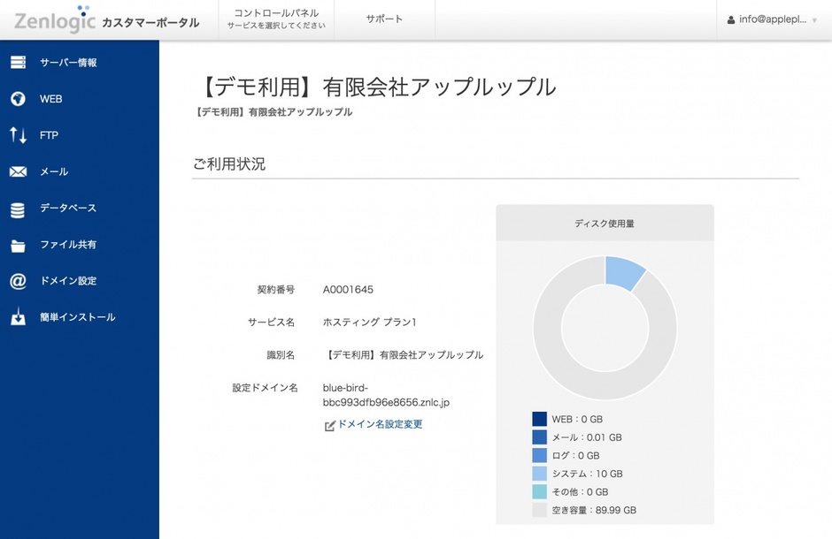 コントロールパネルにログインすると、以下のような画面になります。設定ドメイン名の欄に書かれている xxxxxxxxxxxx..znlc.jp が独自ドメインを設定するまでの間に利用するものになります。