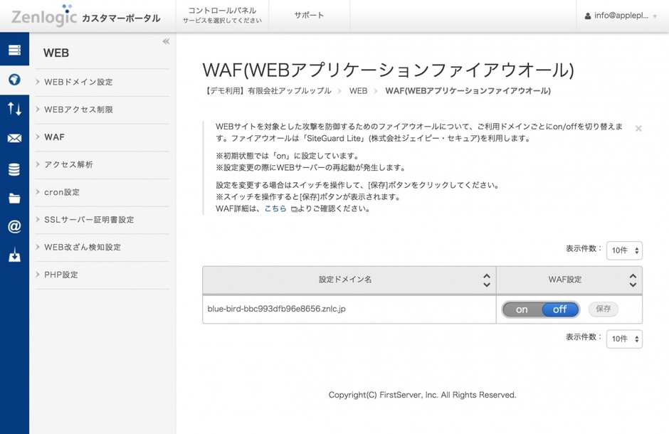 WEBアプリケーションファイアウオールがONの状態だと、CMSでサイトを更新していると正常に動作しなくなりますので、この機能は利用しないように OFF に設定します。