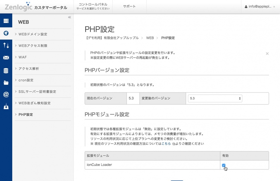 Zenlogic では、php.ini の編集は許可されておりません。そのためサービス側で ionCube Loader をコントロールパネル側で設定できるように対応いただいております。