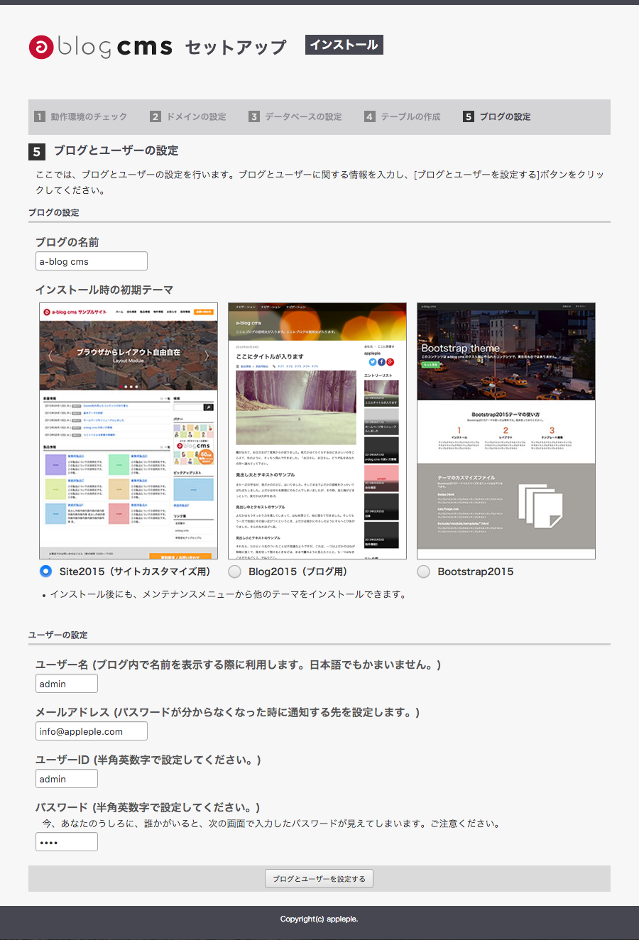ブログとユーザーの設定画面では、インストール時の初期テーマを決めることができます。