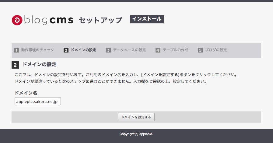 もし、利用したいドメインがフォーム上に入力されていないのであれば、利用したいドメインにURLを変更して前の画面からやり直してください。(独自ドメインの利用については、コントロールパネル上で設定が済んでいる必要があります)