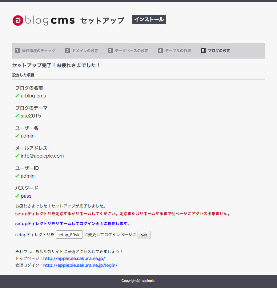 このページから setup ディレクトリを変更する機能が用意されておりますので、setup を他の名前に変更してください。(表示された時点で setup_ランダム文字列 が設定されています)もし、移動ボタンをクリックしないで画面を閉じて終了してしまった場合には、FTPソフト上から setupディレクトリの名前を変更してください。