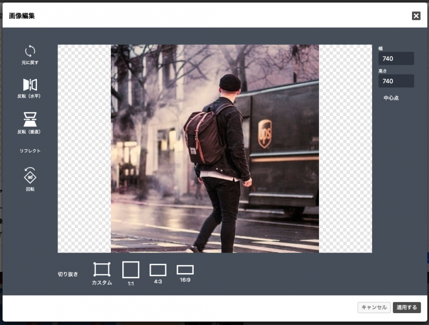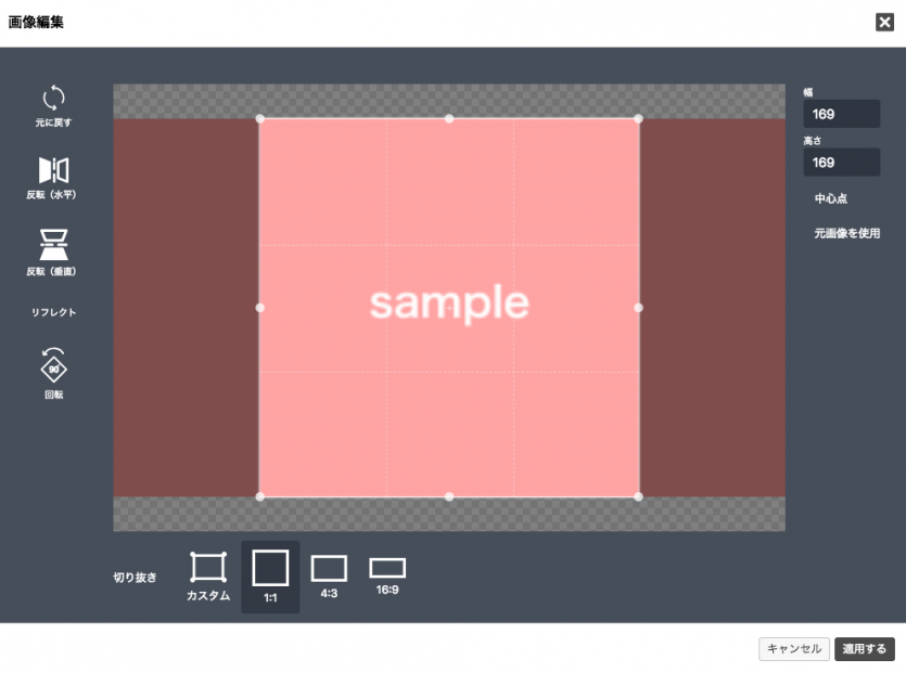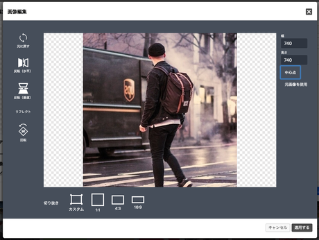 メディアが画像ファイルの場合、「編集ボタン」からさらに画像のトリミングなどの機能を利用可能です。「編集ボタン」をクリックすると以下のように画像編集用のモーダルウィンドウが表示されます。