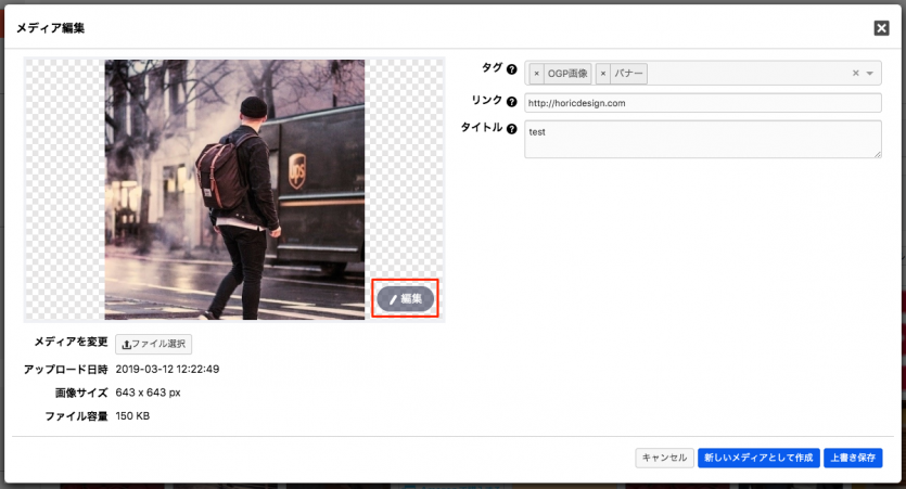 「上書き保存」は、すでに登録されているメディアを上書きする形で保存します。「新しいメディアとして作成」は今編集しているメディアの情報は変更せず、変更内容を元に新しいメディアとして保存します。ですので、「新しいメディアとして作成」したばあいは、変更前の画像と変更後の画像が両方ともメディアに登録されるかたちになります。