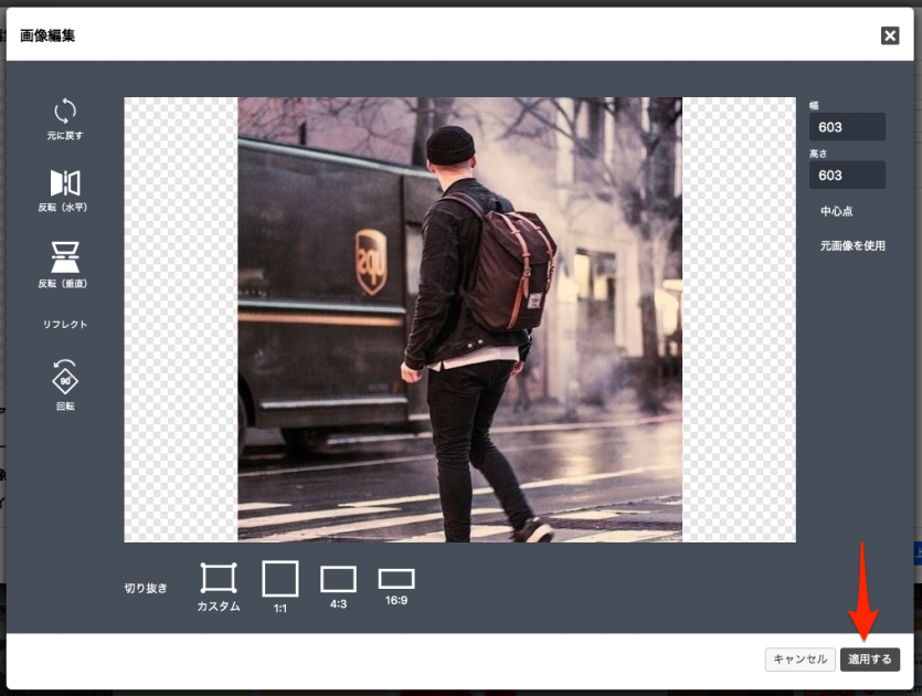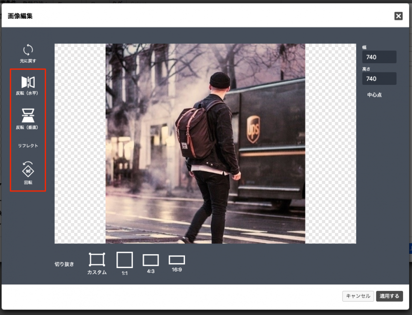 また、画像編集モーダル上では画像を反転させたり回転させたりすることが可能です。以下の画像の赤枠で囲われたエリアのボタンをクリックしてみましょう。