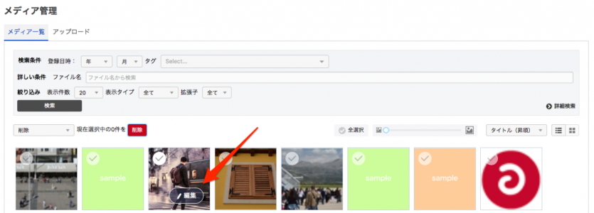 管理画面 > メディア管理 よりメディアに登録した画像やファイルを編集することができます。