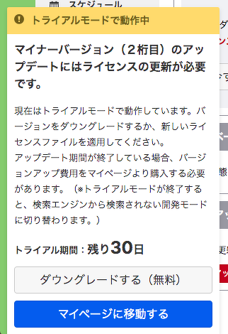 30日間のトライアルモードに切り替わります。30日経過後は開発モードに切り替わります。開発モードに切り替わったあとそのまま運用すると、サイトが検索エンジンから検索されない状態になったり、閲覧ページにもアラートが表示されます。 開発モードにならないために、トライアルモード期間中に新しいライセンスファイルを適用することをお勧めします。