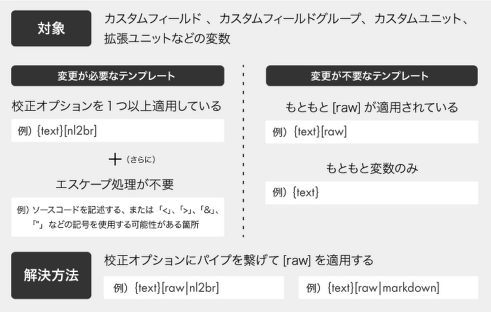 カスタムフィールド 、カスタムフィールド グループ、カスタムユニット、拡張ユニットなどの変数を仕様している 1つ以上の校正オプションを適用している 「<」、「>」、「&」、「"」などの文字列の入力(例:ソースコードなど)を許可しているけど、[raw]校正オプションを適用していない