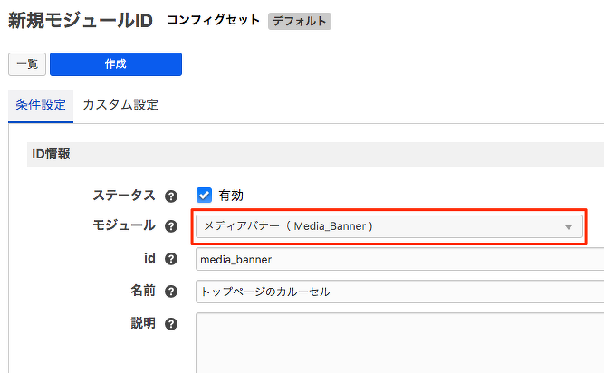 管理画面 > モジュールIDより、「モジュールIDを作成」ボタンをクリックします。新規モジュールID作成ボタンにてモジュールに「Media_Banner」を選択し、他の項目は任意に設定し作成します。