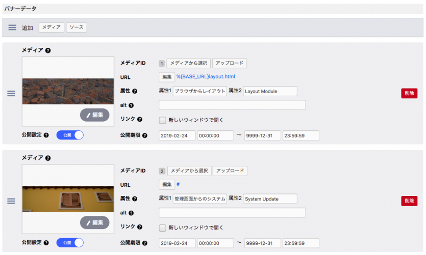 Ver.2.10のメディア機能のアップデートに伴い、登録したメディアを有効活用できるように バナーモジュールの後継としてメディアバナーモジュールをあらたに追加しました。このモジュールを使うとメディアに登録した画像の中から画像を選択して、バナーモジュールのように利用することができます。 バナーモジュールよりも画像を登録する際の使い勝手が大きく向上しており、エントリー編集ページのようなユニット形式で画像を登録することができます。 モジュール側で利用できる変数はバナーモジュールと同じです。