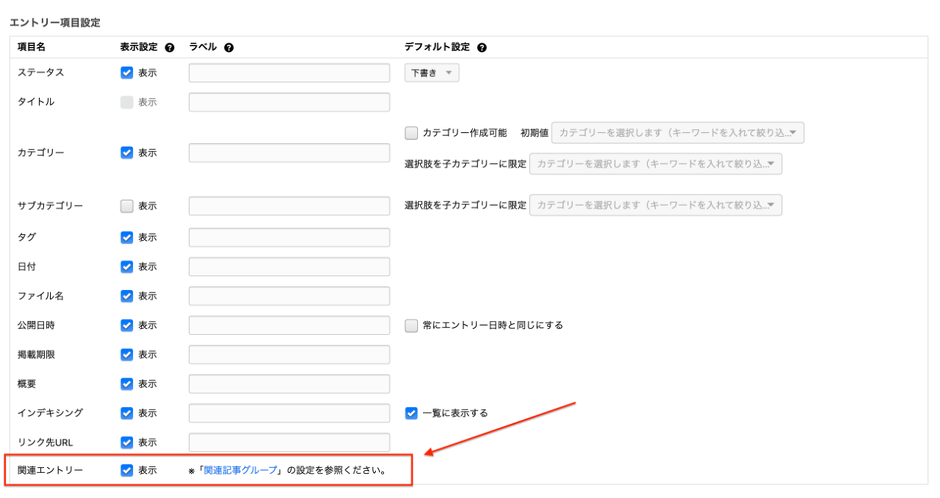 次に「表示設定」で、「関連エントリーのサマリーを表示する」にチェックをつけて、表示する関連記事グループを選択します。