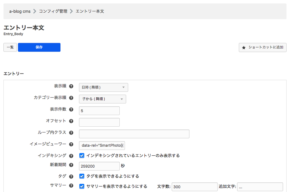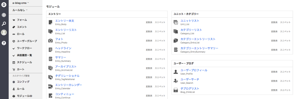 a-blog cmsでは、様々な情報を表示するのに適した各モジュールがありますが、さらにその表示を制御するために各モジュールのコンフィグ(=設定)があります。管理ページ内の左側メニューのカスタマイズ管理 > コンフィグ から各モジュールを含めた設定への一覧があります。各モジュール名から設定画面へリンクしています。