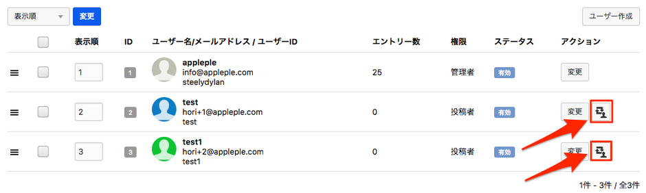 管理画面 > ユーザー管理 に移動すると下の画像のようにユーザーを変更するためのボタンがみつかります。
