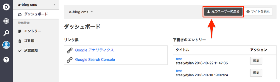 a-blog cms Ver.2.9よりユーザー切り替え機能が実装されました。これにより権限が違うユーザーに切り替えて、そのユーザーでログインした時の挙動などを簡単に調べることができるようになりました。