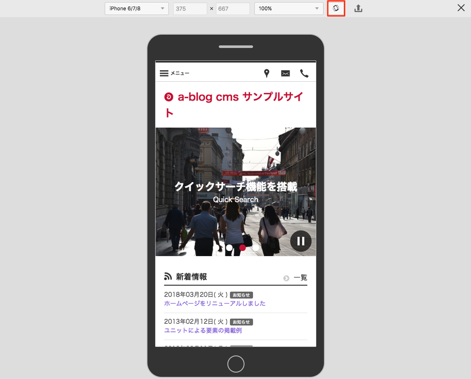 また、以下の図の赤の枠で囲まれたボタンをクリックするとデバイスの縦向き、横向きを切り替えることができます。