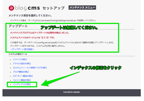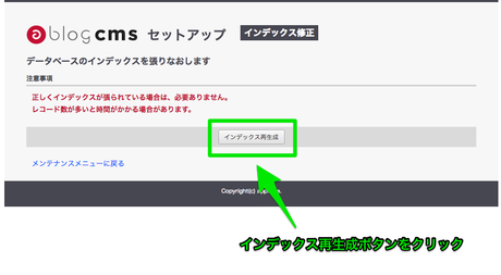 次に、システムの修正ツール > インデックスの修正 のリンクを踏んで、 インデックス再生成ボタン を実行します。これには時間がかかる場合があります。