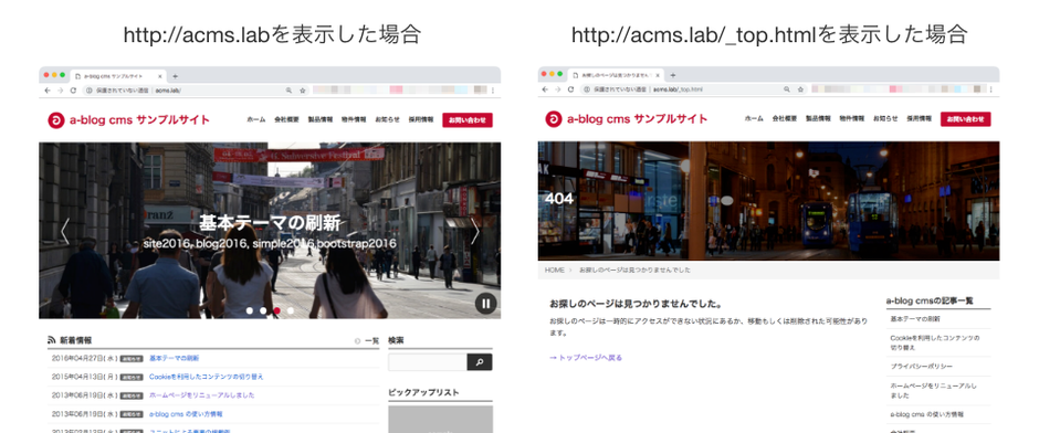 上記の例のように同じコンテンツが複数のURLで表示されることが問題になる場合があります。対応策としては、top.html にアクセスがあった場合、301リダイレクトをして正規化する事が考えられますが、a-blog cmsの機能で404を表示させることが可能です。この記事では直接表示させないテンプレートを指定する方法をご紹介します。