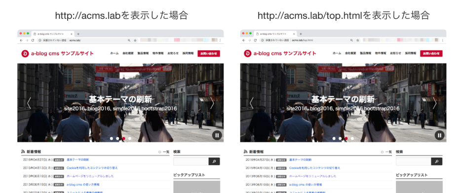 もちろん、「https://example.com/」のURLでページを開いたときに「top.html」がトップページとして動的に表示されるのですが、静的なHTMLと同じようにテーマを作成できる特徴を持っているため「https://example.com/」と「https://example.com/top.html」のURLでページを開いたときにはどちらも同じコンテンツが表示されます。