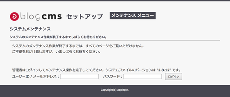 「 http://現在の公開URL/変更後の任意名/index.php 」にアクセスします。 メンテナンスプログラムへのアクセスには、ルートブログの管理者権限をもったユーザーのID/メールアドレスと、パスワードが必要です。