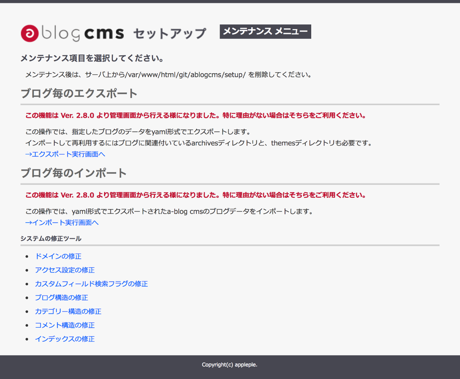 このドメイン修正機能は、メンテナンスプログラム(setup)に含まれています。setupは、インストール時にアップロードした同名のディレクトリと、その中のプログラムファイル群を指します。これらプログラムはインストール後も、システム全体に関わるメンテナンス機能に利用できます。