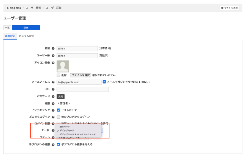 新規インストール時は config.server.php でのデバッグモードの設定は 0 になっています。Ver. 3.1.x 以上では管理ユーザーの場合のみ、ユーザー編集画面で、そのユーザー限定でデバッグモードとベンチマークモードになることができるオプションが用意されているのでこちらを使用することを推奨します。開発環境でも本番環境でも、気軽にデバッグモードとベンチマークモードを試すことができます。