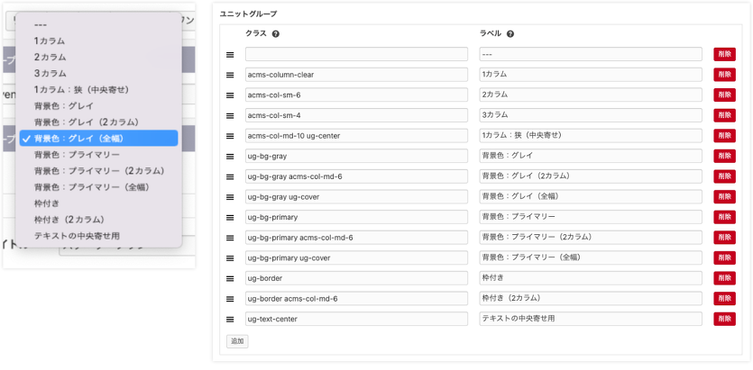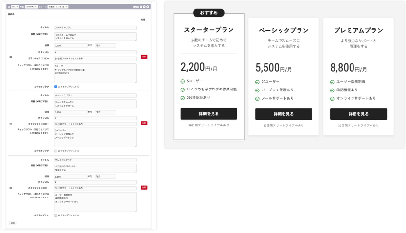 ユニットグループも豊富に用意されています。デモデータではたとえばユニットによる要素の掲載例の価格表には「背景色:グレイ(全幅)」が使われています。