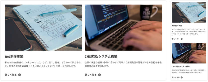 事業紹介(service)カテゴリーインデックスのエントリーサマリーはサムネイルを大きくとったスタイルです。このスタイルはモジュールユニットにおいても thumbnail.html を選択すればそのまま使用できます。